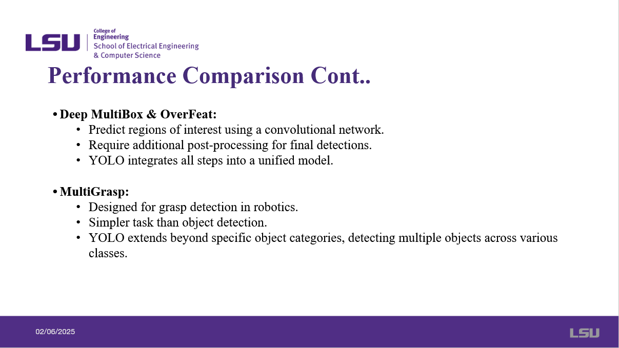 More comparisons: Deep Multibox and Overfeat use a convolutional network to predict regions of interest. They require additional post-processing for final detections, while YOLO integrates all steps into a unified model. MultiGrasp is designed for grasp detection in robotics. This is a simpler task than object detection, and YOLO extends beyond object categories with the ability to detect multiple objects across various classes.