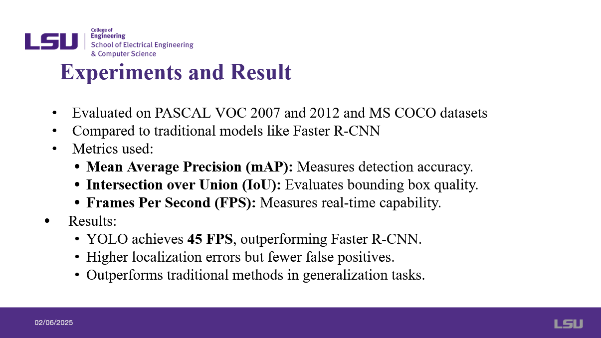 Important metrics include: mAP (Mean Average Precision), which measures detection accuracy, IoU (Intersection over Union), which evaluates bounding box quality, and FPS (Frames Per Second), which measures real-time capability. YOLO achieves 45 FPS, many more frames faster than Faster R-CNN at 18 FPS. YOLO has higher localization errors, but fewer false positives. YOLO also outperforms traditional methods in generalization tasks.