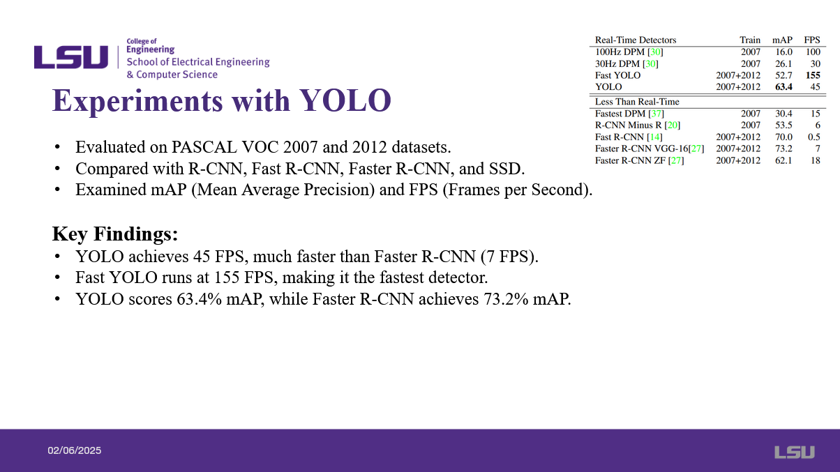 YOLO's effectiveness was evaluated on the PASCAL VOC 2007 and 2012 datasets, and was compared with R-CNN, Fast R-CNN, Faster R-CNN, and SSD. mAP and FPS were examined. As stated before, YOLO achieves 45 FPS, much faster than Faster R-CNN's maximum FPS at 18 FPS. YOLO has a faster variant: Fast YOLO, achieving the fastest speed of 155 FPS. YOLO scores 63.4% mAP while Faster R-CNN achieves 73.2% mAP.