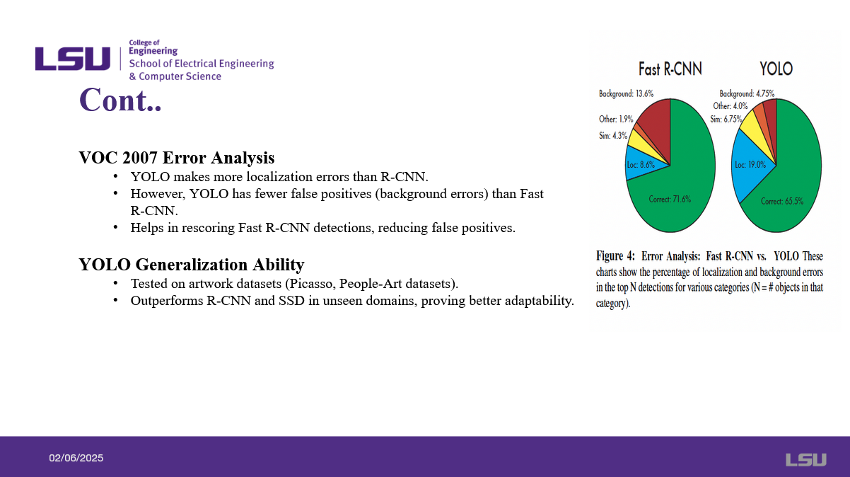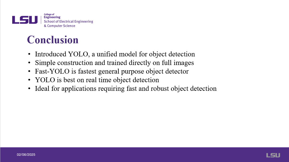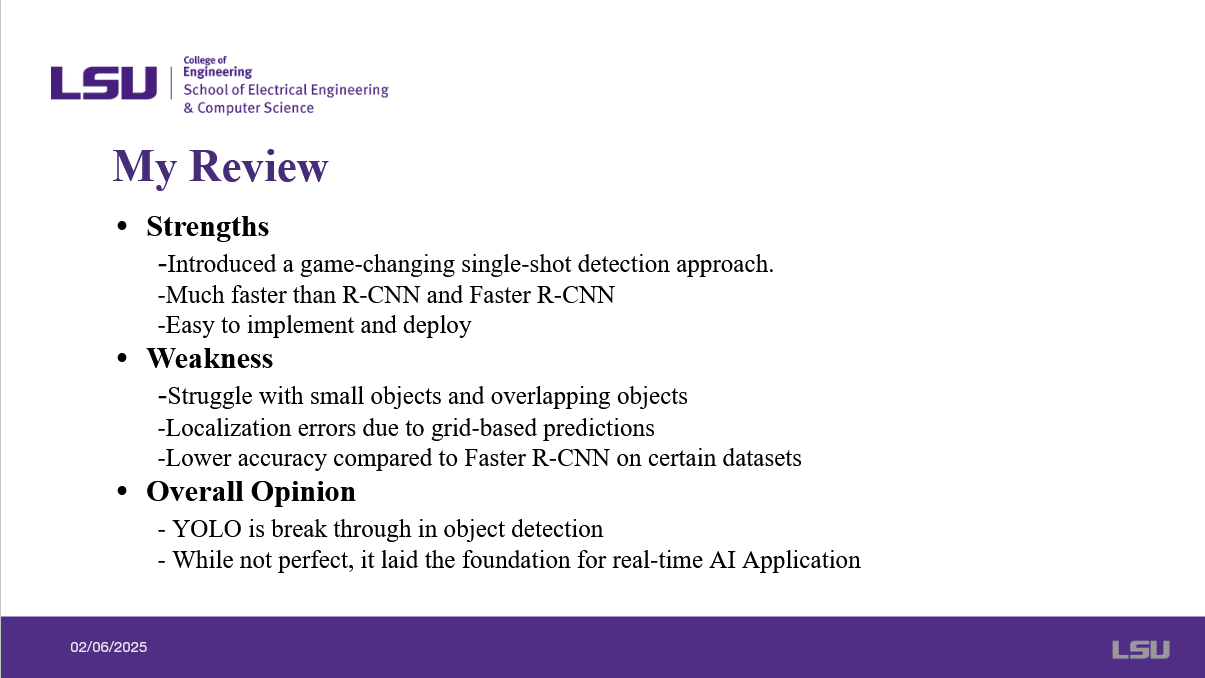 Strengths of the paper: Introuced a game-changing single-shot detection approach. It is faster than Faster R-CNN while being easy to implement and deploy. Weaknesses of papers: YOLO struggles with small objects and overlapping objects. Localization errors are introduced due to grid-based predictions. It also has lower accuracy compared to Faster R-CNN on certain datasets. Overall, YOLO is a breakthrough in the automated object detection domain and, while not perfect, laid the foundation for real-time AI object detection applications.