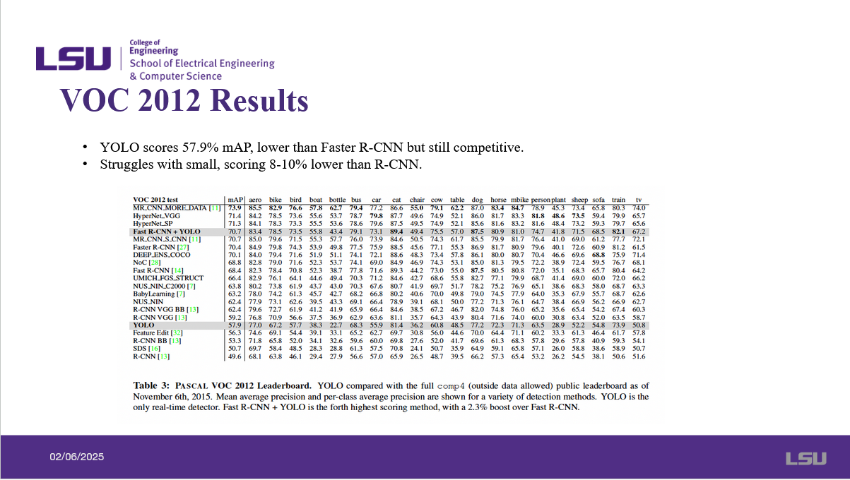 YOLO scores 57.9% mAP, which is lower than Faster R-CNN, however is still competitve. YOLO does struggle with small objects on the VOC 2012 dataset, scoring 8-10% lower than R-CNN.