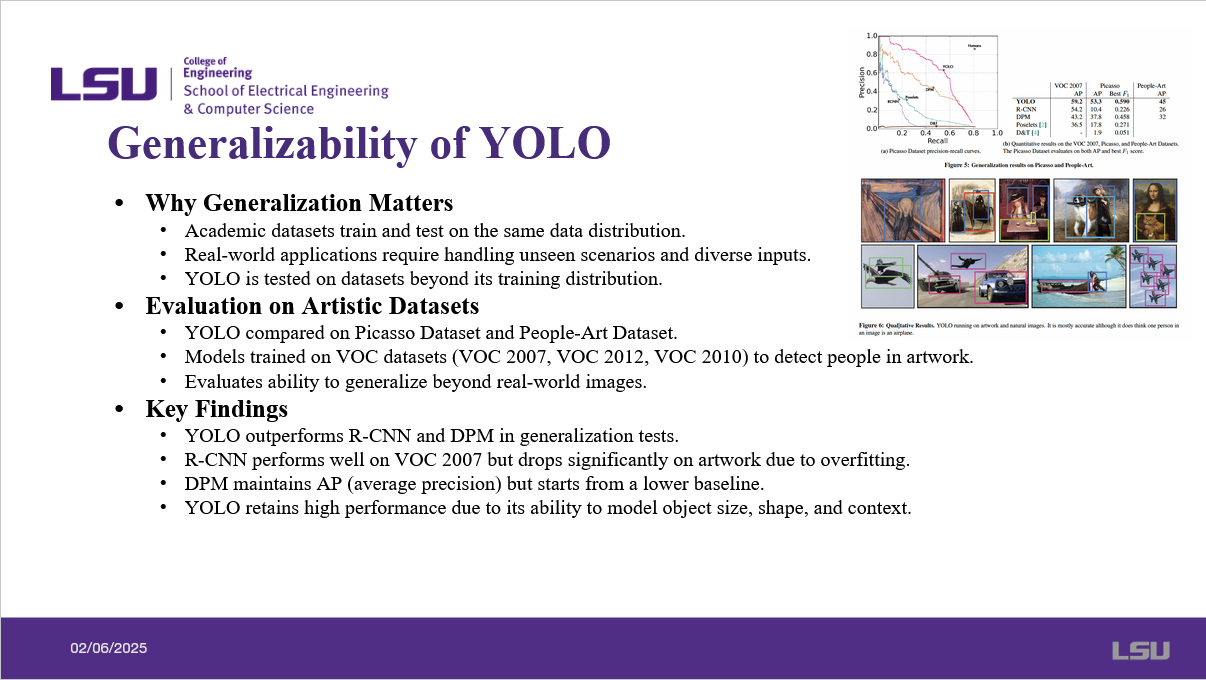 YOLO was tested on datasets beyond its training distribution to measure its generalizability. Real-world applications require handling unpredictable scenarios and diverse inputs, so generalizabiliy is an important aspect to measure. YOLO, when testing on the Picasso and People-Art datasets, outperforms R-CNN and DPM in generalization tests. R-CNN performs well on VOC 2007, but drops significantly on artwork due to overhitting. DPM starts from a lower baseline but maintains AP. YOLO retains high performance due to its ability to model object size, shape, and context.