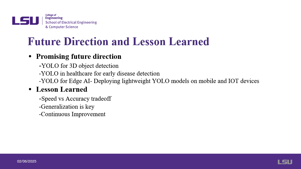 YOLO has potential for future applications in 3D object detection, healthcare for early disease detection, and Edge AI - deploying lightweight YOLO models on mobile and IOT devices. Overall, there is a tradeoff involving speed and accuracy, generalization is important, and improvement in this domain is continuous.