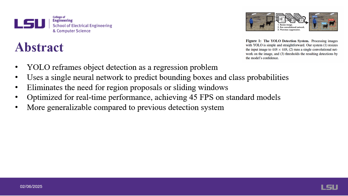 Sujan Gyawali presents the paper You Only Look Once: Unified, Real-Time Object Detection. This paper presents YOLO, a real-time object detection method that achieves better accuracy with object detection than comparable real-time object detection methods. The authors found that when YOLO is used in conjunction with Faster CNN, it achieves better accuracy than without its implementation.