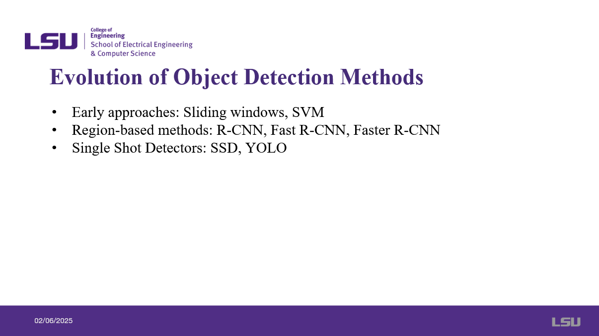 Early approaches of object detection methods include sliding windows and SVM. Later, R-CNN was developed alongside two variants: Fast and Faster R-CNN. There are also single shot decoders, such as SSD and now YOLO.