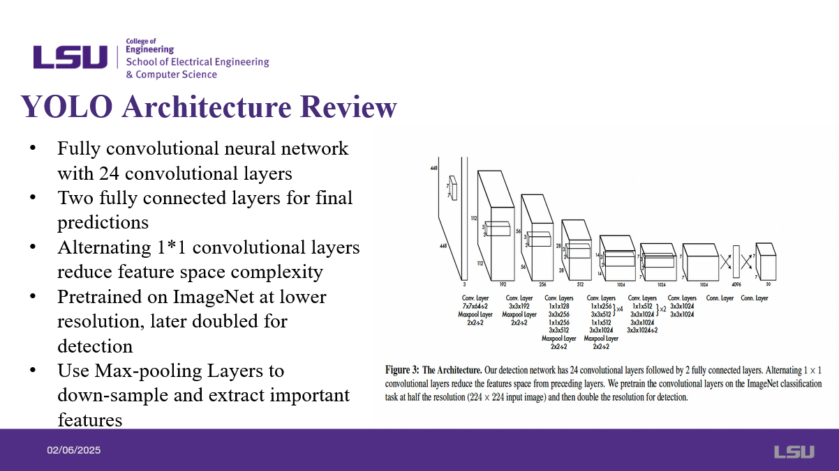 The YOLO architecture involves 24 convolutional layers within the neural network, with two fully connected layers involved in final predictions. Feature space complexity is reduced by alternating convolutional layers. YOLO is pretrained on ImageNet at lower resolution, which is later doubled for detection. YOLO uses max-pooling layers to down-sample and extract any important features.