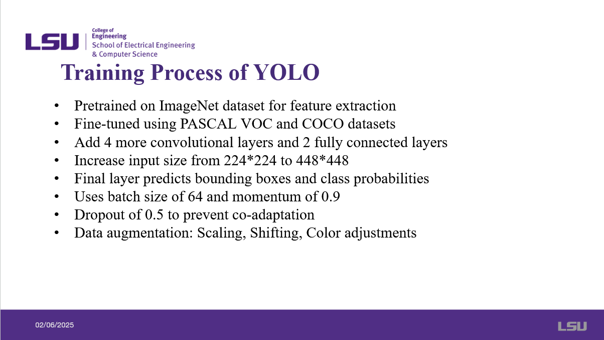 The training process of YOLO involves pretraining on the ImageNet dataset for feature extraction, fine-tuning on the PASCAL VOC and COCO datasets, and adds 4 more convolutional layers and 2 fully connected layers, increases the input size from 224*224 to 448*448. The final layer predicts the bounding boxes and class probabilities. YOLO uses a batch size of 64, a momentum of 0.9, and a dropout of 0.5 to prevent co-adaption.