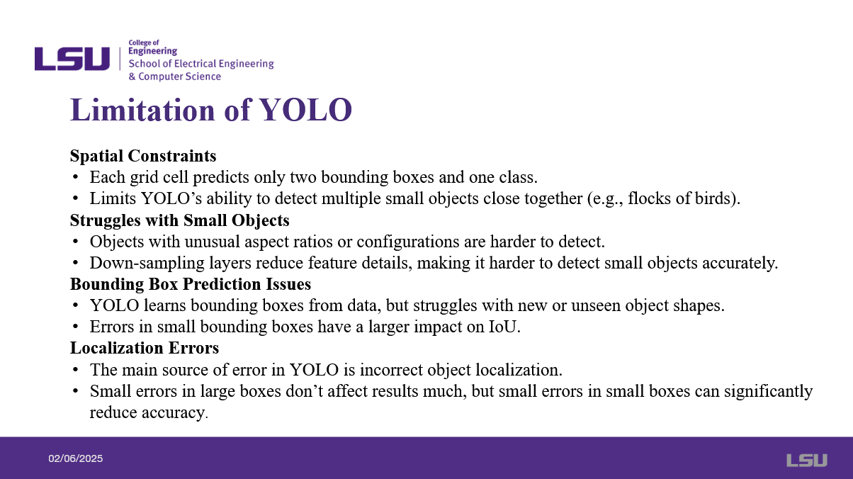 YOLO has some limitations, such as each grid cell only predicting two bounding boxes and one class. This limits YOLO's ability to detect multiple small objects that are close together. YOLO also struggles to identify objects with unusual aspect ratios or configurations harder to detect. This can also be caused by down-sampling layers, which reduces feature details. YOLO may also struggle with new or unseen object shapes due to errors in small bounding boxes. The main source of error in YOLO is incorrect object localization and small errors in small boxes can significantly reduce accuracy.