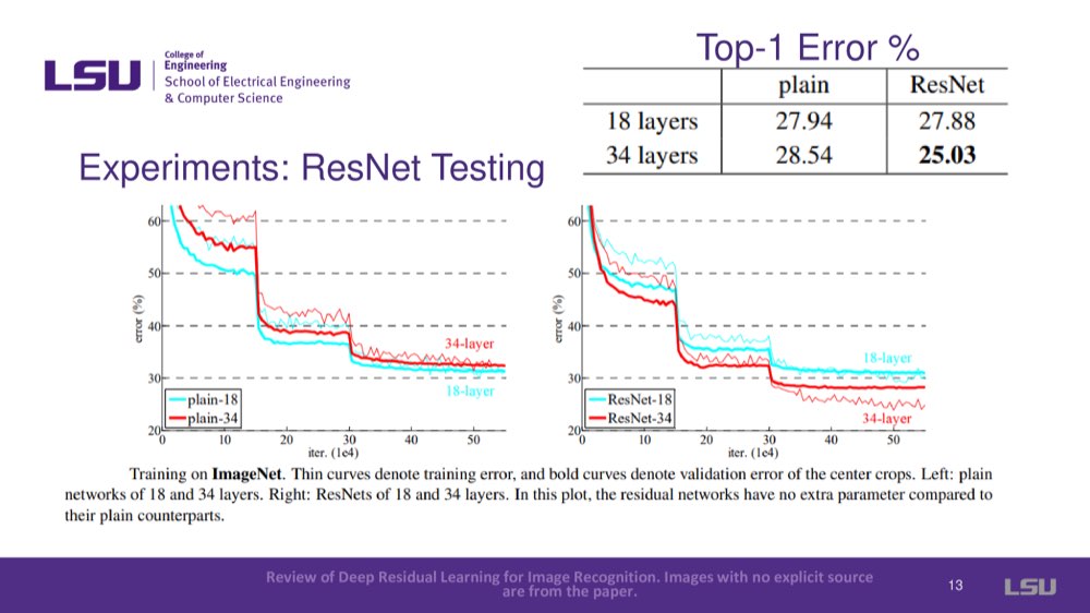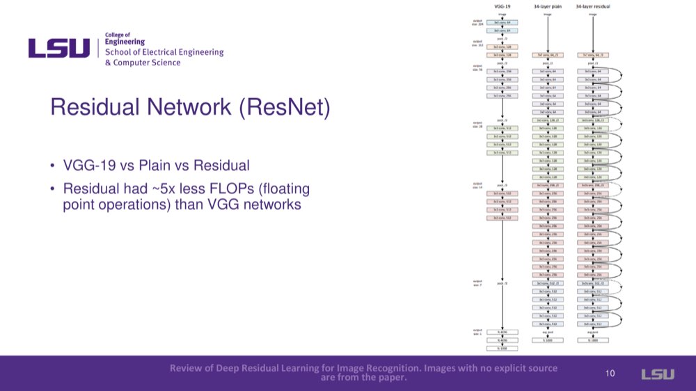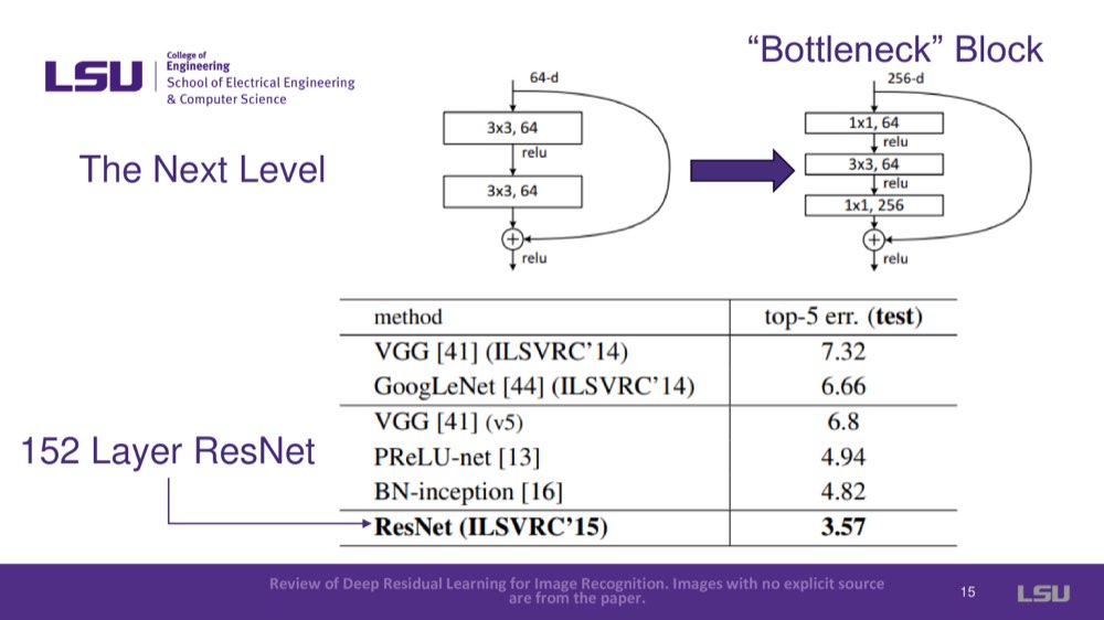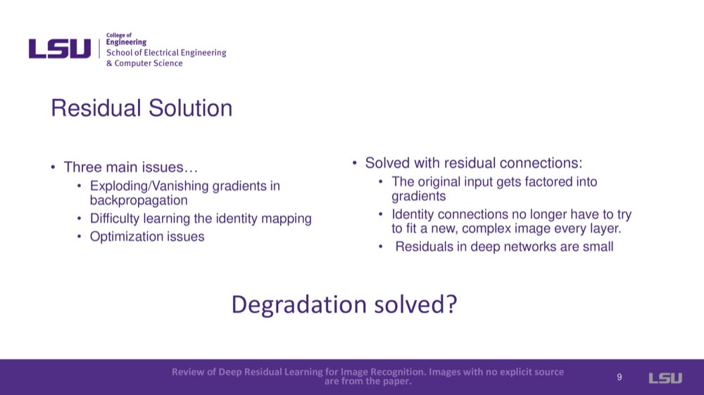 Residual networks can solve the degradation problem through these shortcut connections, which allow networks to go deeper while improving accuracy and reducing the number of parameters required. ResNets did so with fewer parameters than everyone else.