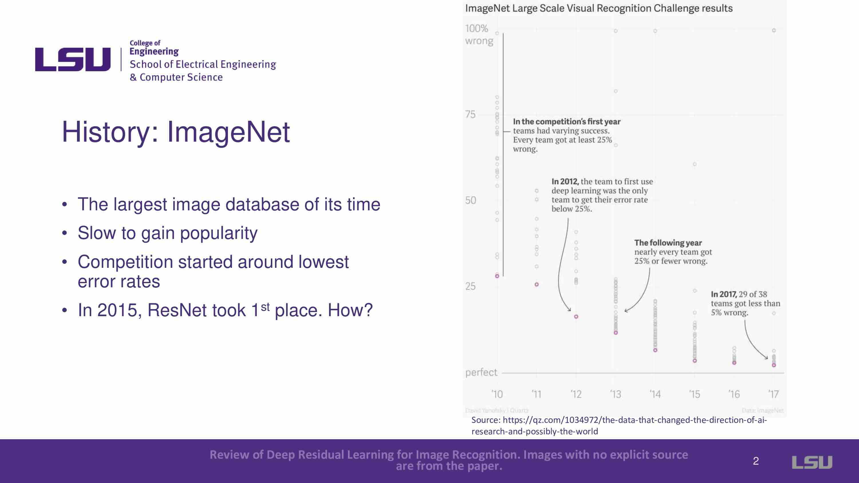 ResNets (Residual Networks) is introduced, and it is mentioned that ResNets won the 2015 ImageNet Large Scale Visual Recognition Challenge. People's curiosity about how they accomplished this led to the publication of the paper in December 2015.