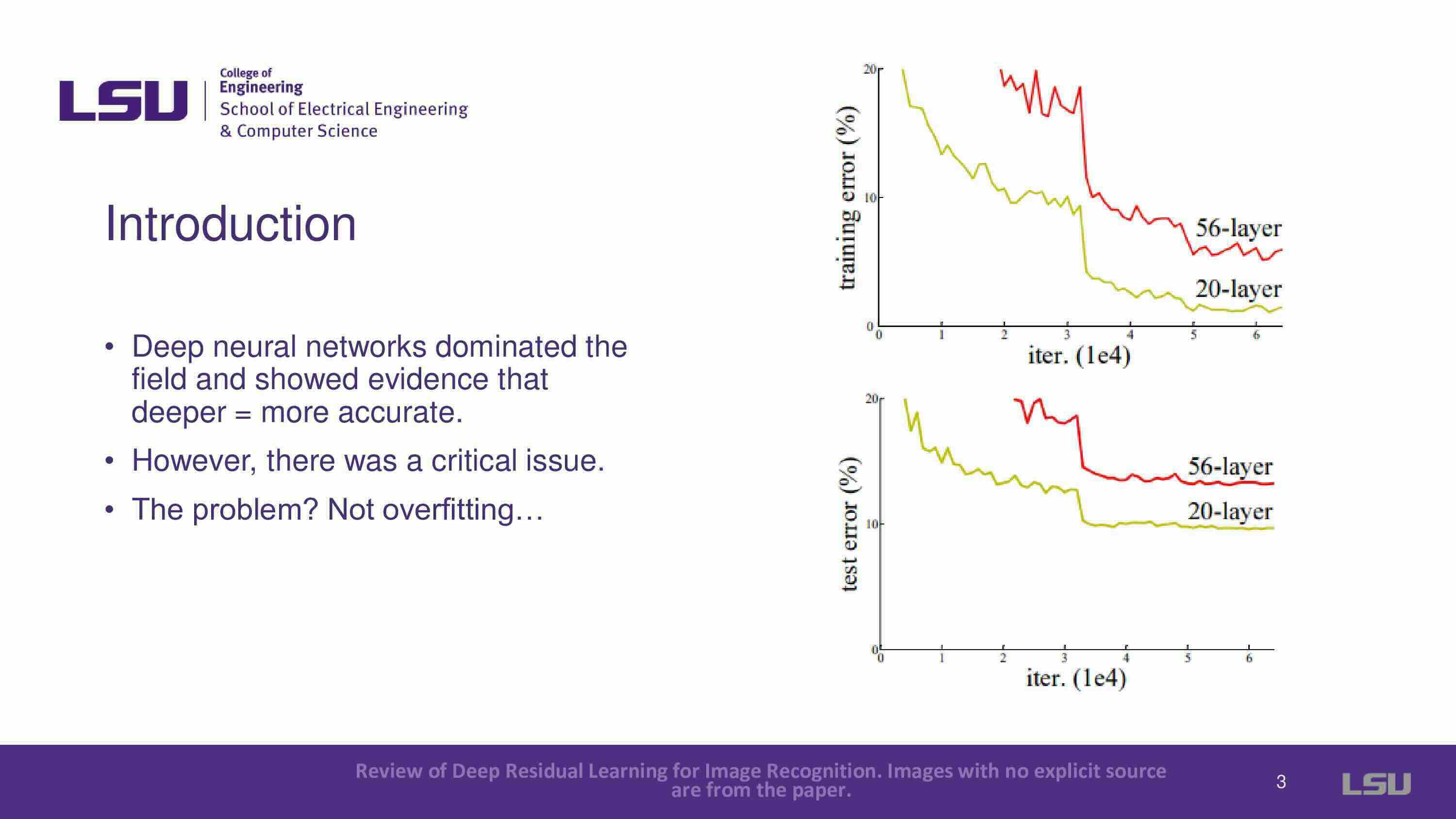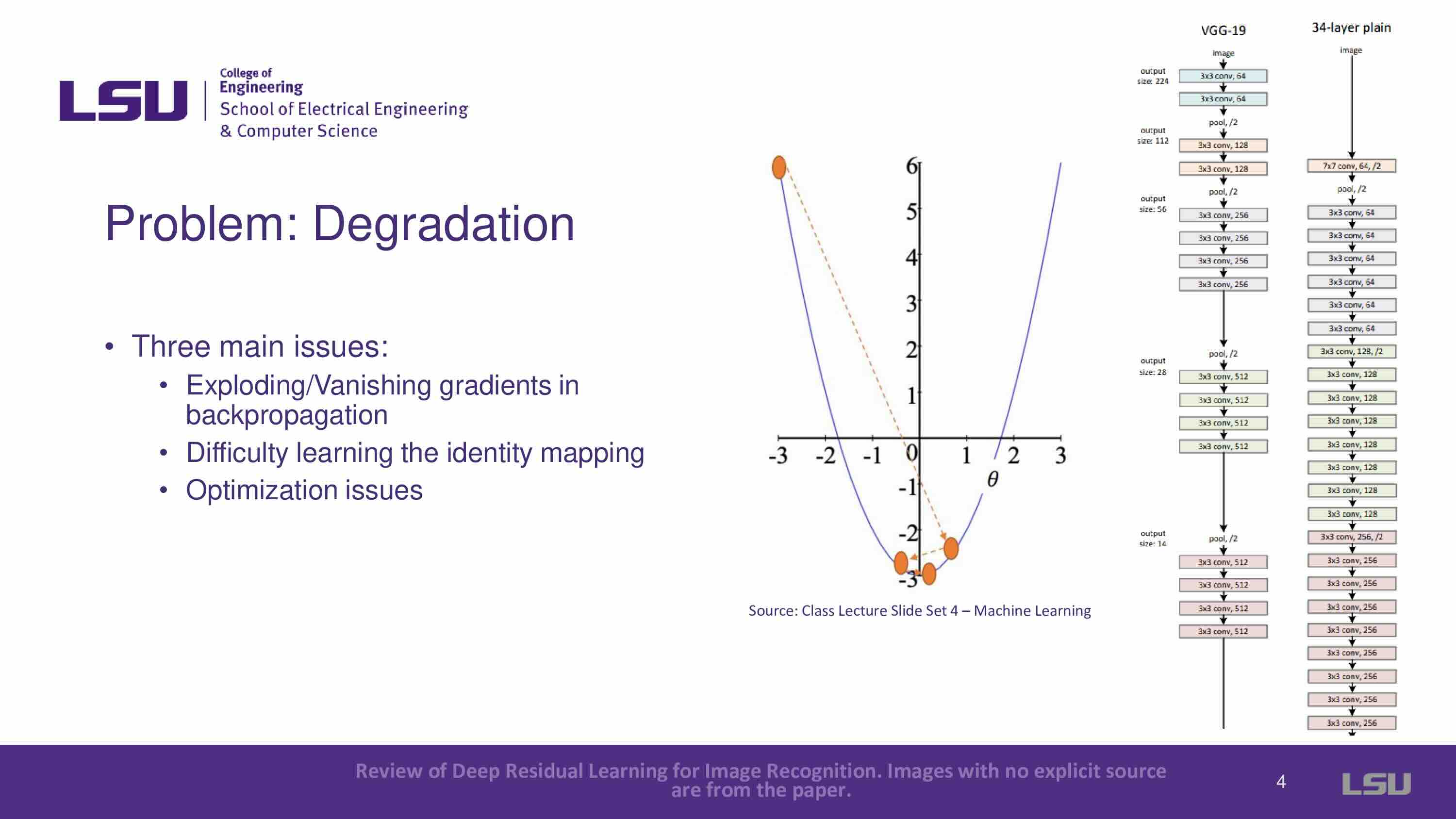 The problem of degradation in deeper networks was addressed. Three main issues with degradation were introduced: exploding/vanishing gradients in backpropagation, difficulty learning the identity mapping, and optimization issues. For vanishing gradients, deeper layers had no reference to the original input. Therefore, it is difficult to adjust weights, especially in deeper networks, and will lead to exploding or vanishing gradients that caused networks to either not converge or get stuck in local minima. For the second problem, difficulty learning identity mapping, the expectation was that a deeper network could map identity (the output should match the input), but this wasn’t the case, and deeper networks failed to maintain accuracy. The third problem is optimization complexity. Each layer in traditional networks had to create a completely new function for every input, increasing the complexity and number of parameters unnecessarily.