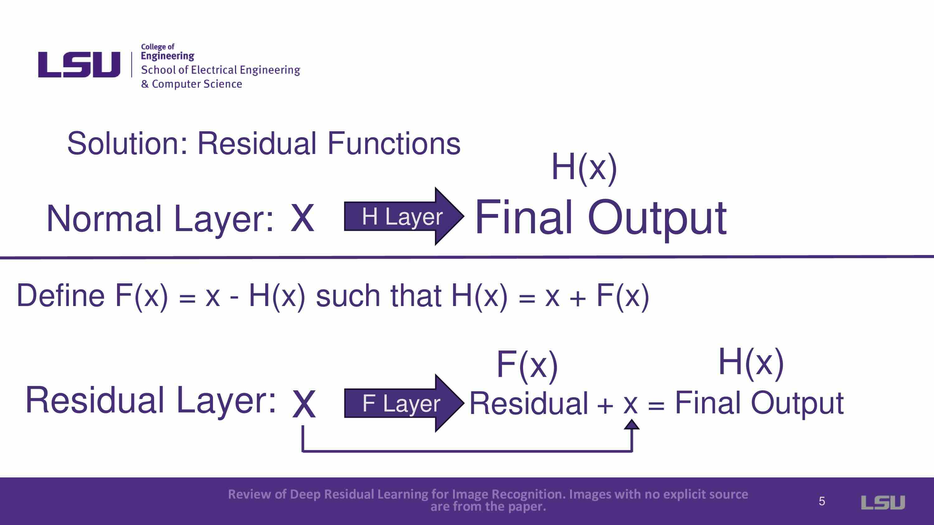 Introduces the concept of residual functions, where instead of trying to map new complex functions in each layer, the residual connection focuses on learning the difference (residual) between input and output and adds that to the input. Formulation: X + F(x) = H(x) where X is input, F means residual layer, F(x) means what after Residual, H(x) means output.