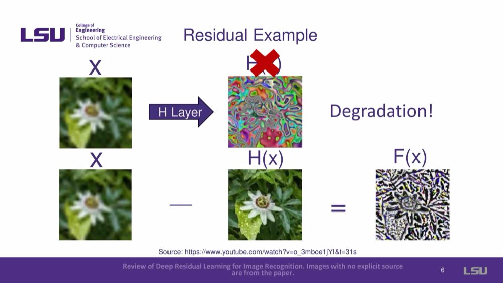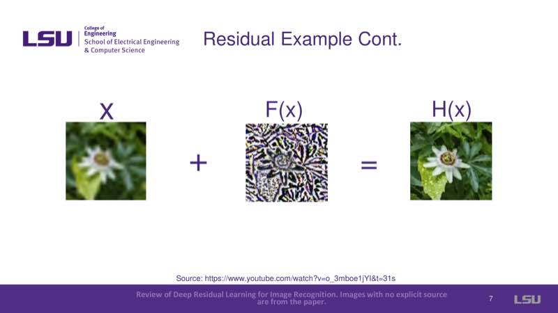 Provides a visual representation of residual functions: X + F(x) = H(x), where x is a blurred image, F(x) is a residual layer, and H(x) is the output image, which is very clear.